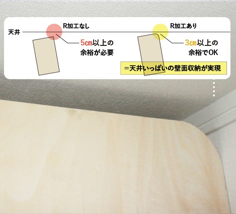 壁面収納の背面側の角にR50の丸みを付けることで、天井から-30mmの高さでも設置できるようにする加工です。 ぎりぎりの高さまで収納にしたいお客様にオススメです。 (R加工なしの場合、天井から-50mm以上の余白が必要です。) 料金:壁面収納OSAMARU1台につき3,300円(税込)