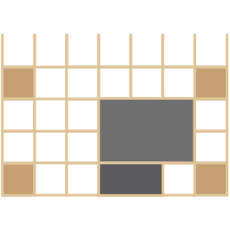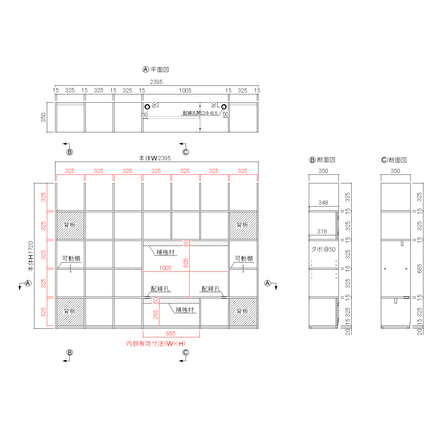 縦・横1マス:W325×H325×D348 縦1コマ×横コマ:W665×H325/265×D318/334 背板部分:D318 可動棚:D348 地板:D334 |
