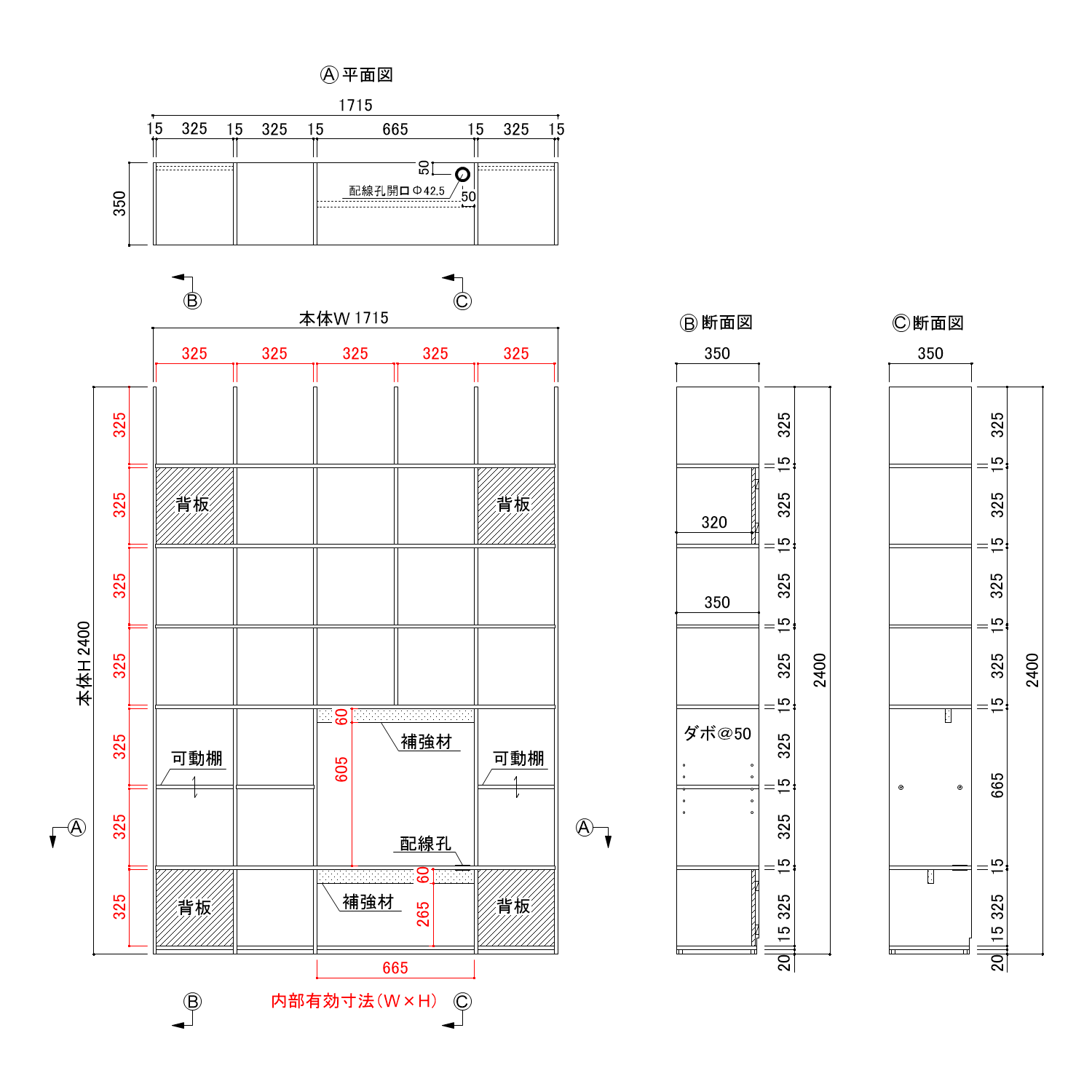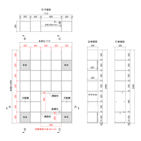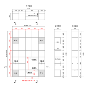 縦・横1マス:W325×H325×D348 縦1コマ×横コマ:W665×H325/265×D318/334 背板部分:D318 可動棚:D348 地板:D334 |