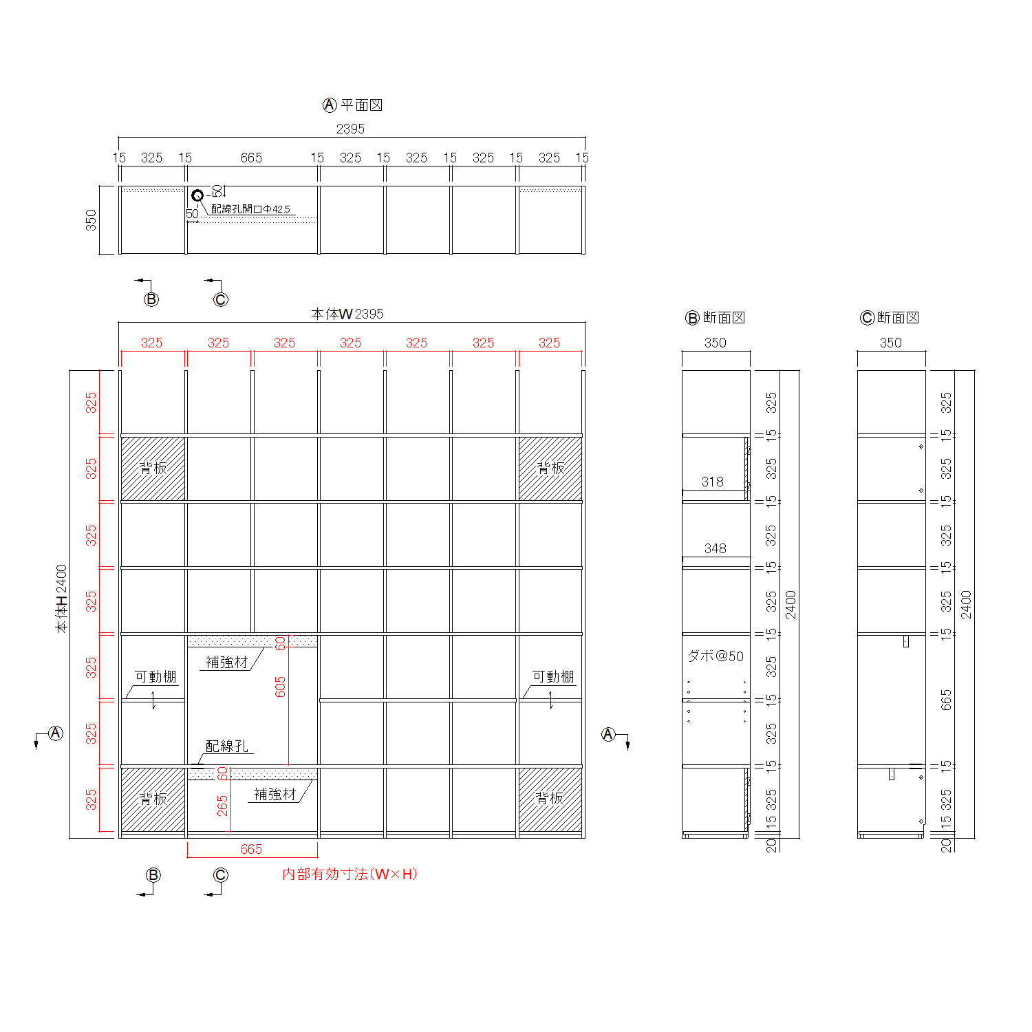 背板部分:D318 可動棚:D348 地板:D334