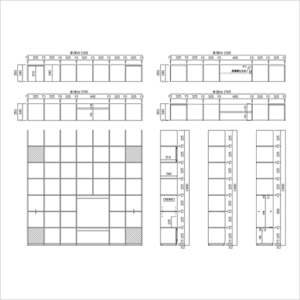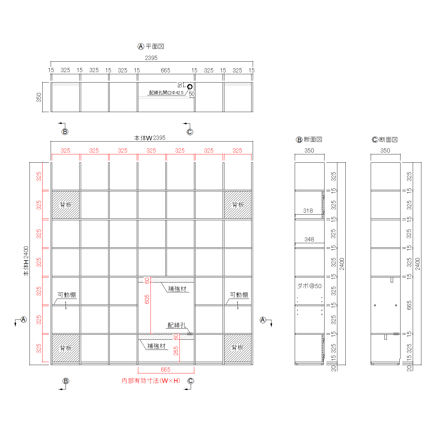 縦・横1マス:W325×H325×D348 縦1コマ×横コマ:W665×H325/265×D318/334 背板部分:D318 可動棚:D348 地板:D334 |
