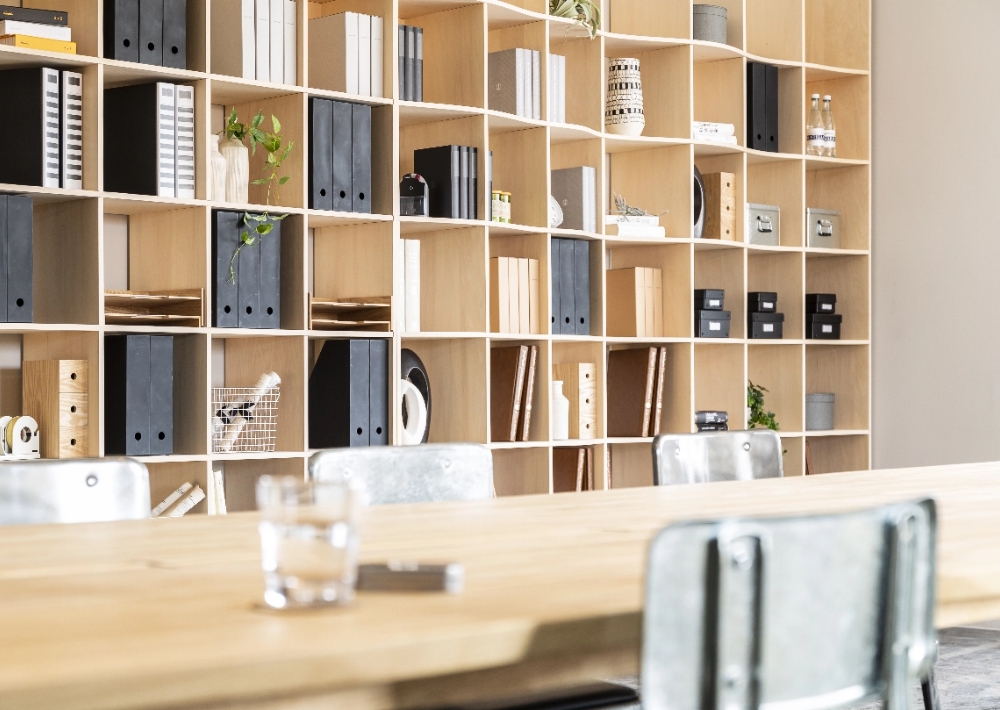 壁一面がすべて収納になるコーナー収納。壁一面が壁面収納になり、一体感のある空間ができあがります。両サイドにしっかりと壁となる板があるのが特徴的です。