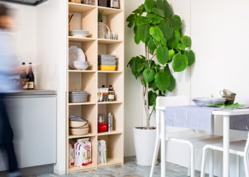 キッチンスペースにもオススメな省スペース壁面収納です。収納スペースが不足しがちなキッチンなどに使用し、大容量の壁面収納を置いて収納力を底上げすることができます。