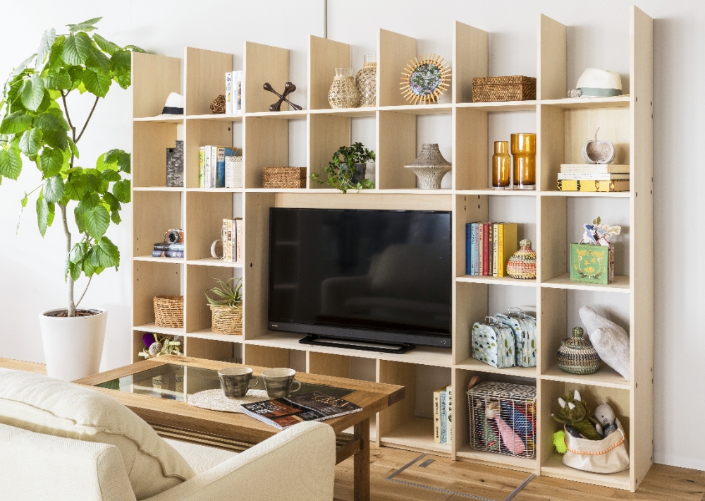 たっぷり収納で「痒い所に手が届く」OSAMARUの壁面収納TVボード。従来のテレビ台と比べ、空間を効率よく収納スペースに変えられます。この開口部サイズは、42インチまでのテレビを設置できます。